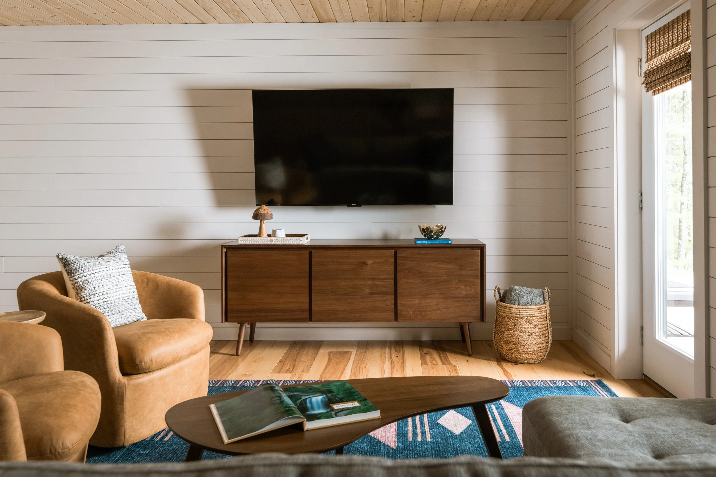 Nestled on over 50 acres of breathtaking mountain land just outside of Asheville, NC, this luxury mountain home is a true gem. The land was passed down from the homeowner's father, who envisioned a peaceful, secluded retreat where friends and family could gather to enjoy the stunning mountain views. After constructing a unique 3-structure tiny house compound, the homeowner turned to us to help bring their vision to life by designing and furnishing the interiors, with a focus on creating a one-of-a-kind vacation rental destination.